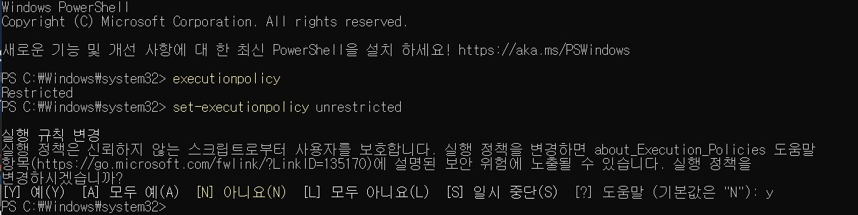 set-executionpolicy 입력 -> y 로 설정