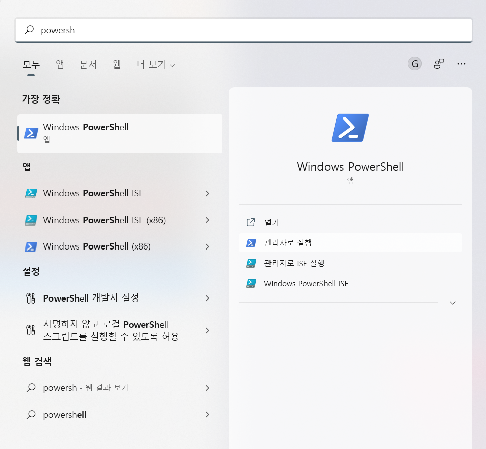 보안오류 뜰 시 powershell 관리자 권한으로 실행